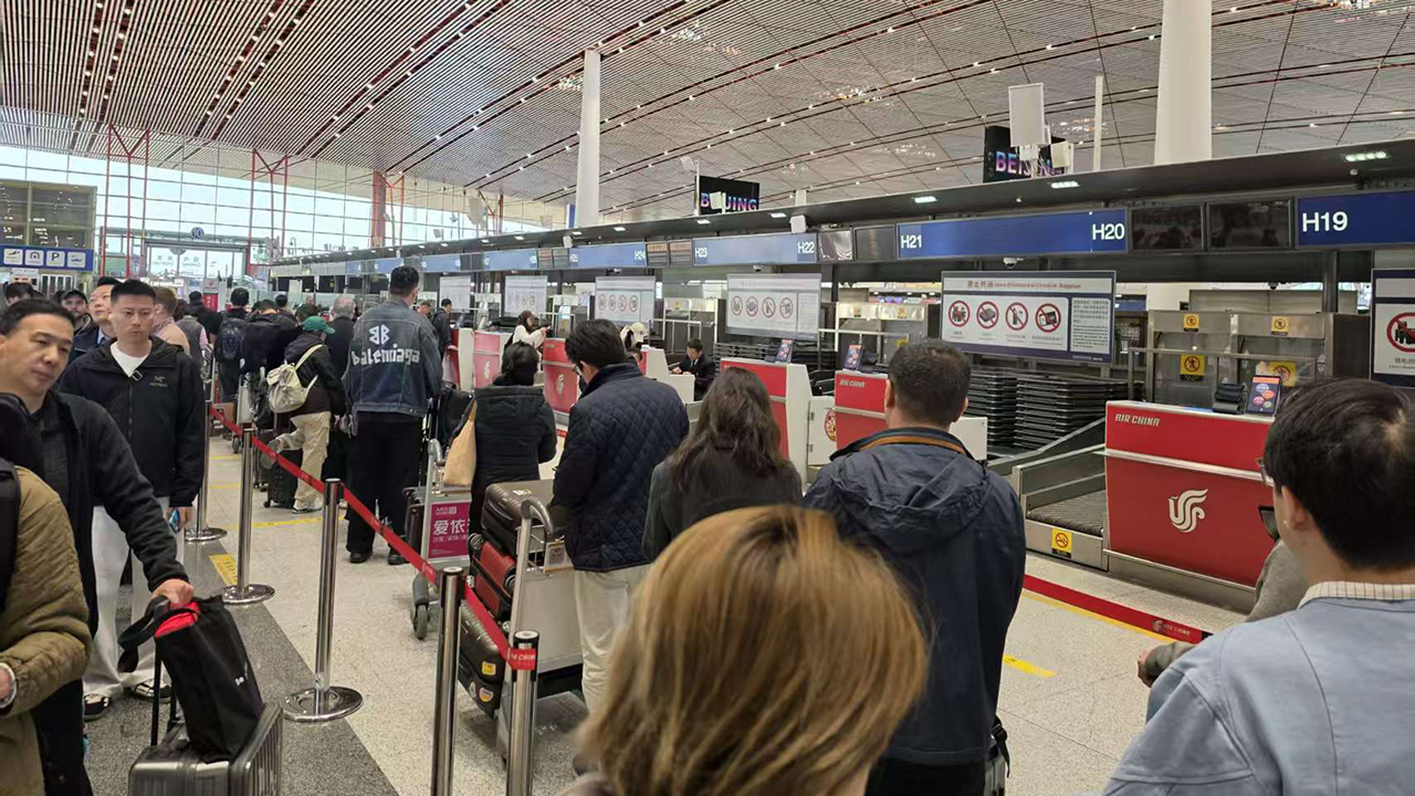 ▲ 30일 중국 베이징 서우두국제공항에서 북한 평양 순안국제공항으로 향하는 중국국제항공(에어차이나) 항공편 운항이 재개된 가운데 탑승객들이 대기하고 있다.