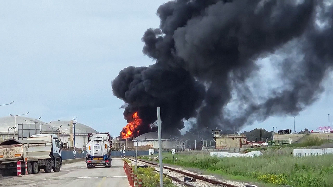 정유소 탱크에서 붉은 화염과 함께 검은 연기가 치솟습니다.