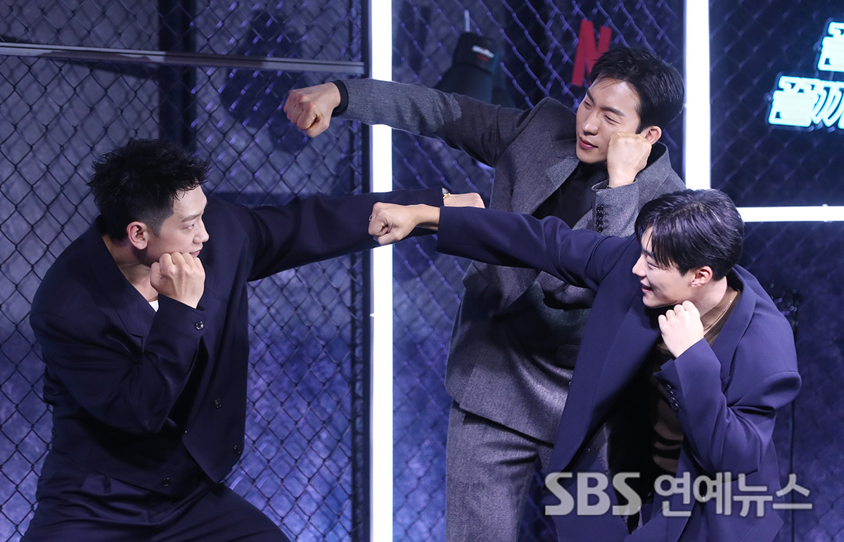 RAIN (from left), Lee Sang Yi, and Woo Do Hwan attended the Netflix series Bloodhounds Season 2 production presentation at the Ambassador Seoul Pullman Hotel in Jung-gu, Seoul, on the morning of March 31 and posed for photos.