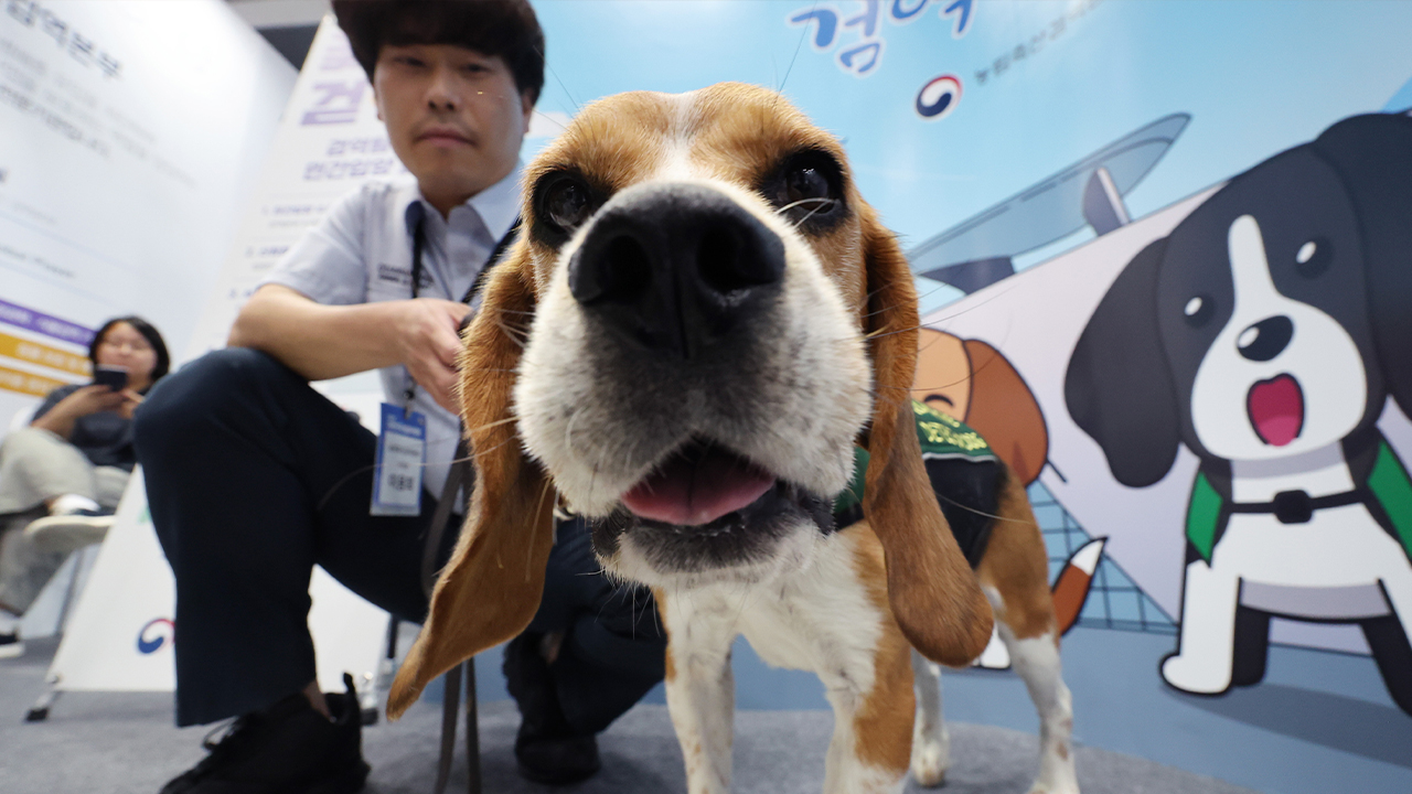 ▲ 서울 서초구 aT센터에서 열린 '2025 대한민국 농업박람회'의 반려산업관에서 검역탐지견이 등장해 민간 입양 홍보를 하고 있다.