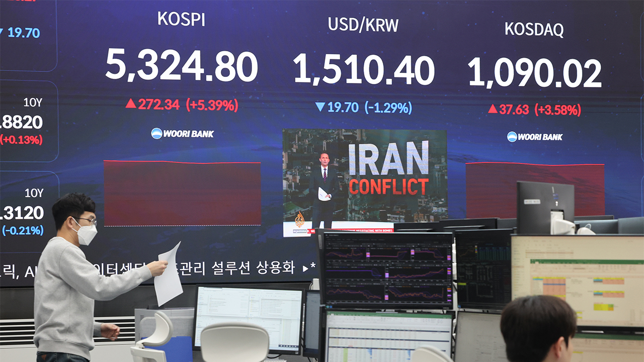 전날 코스피는 중동 전쟁 장기화 우려에 4% 급락해 5,050대로 밀려났으나 이날 급등세로 돌아섰습니다.