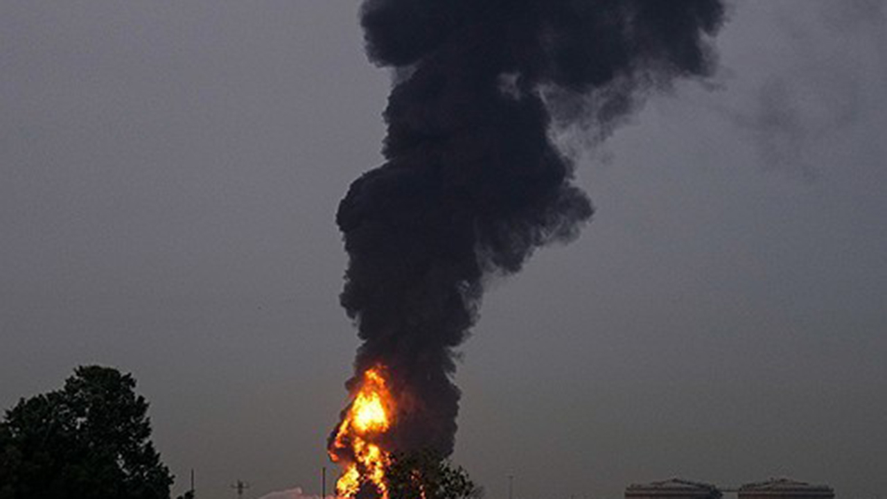 ▲ 지난 16일 오전 두바이 국제공항 인근에서 연료 탱크가 드론 공격을 받아 불길이 치솟고 있다