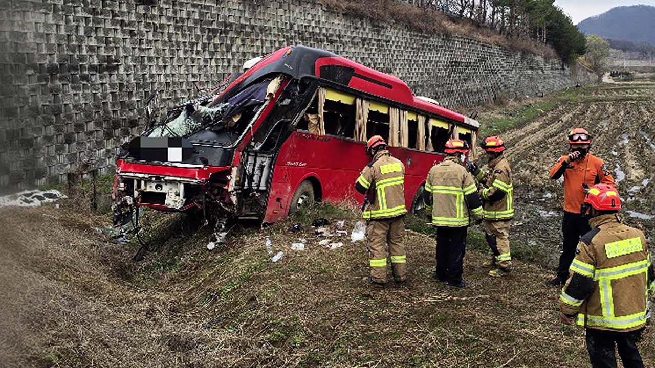 오늘(1일) 오전 7시 40분쯤 음성군 원남면의 한 왕복 4차선 도로에서 승객 23명을 태우고 달리던 통근버스가 승용차와 충돌하며 7미터 아래 논으로 추락했습니다.