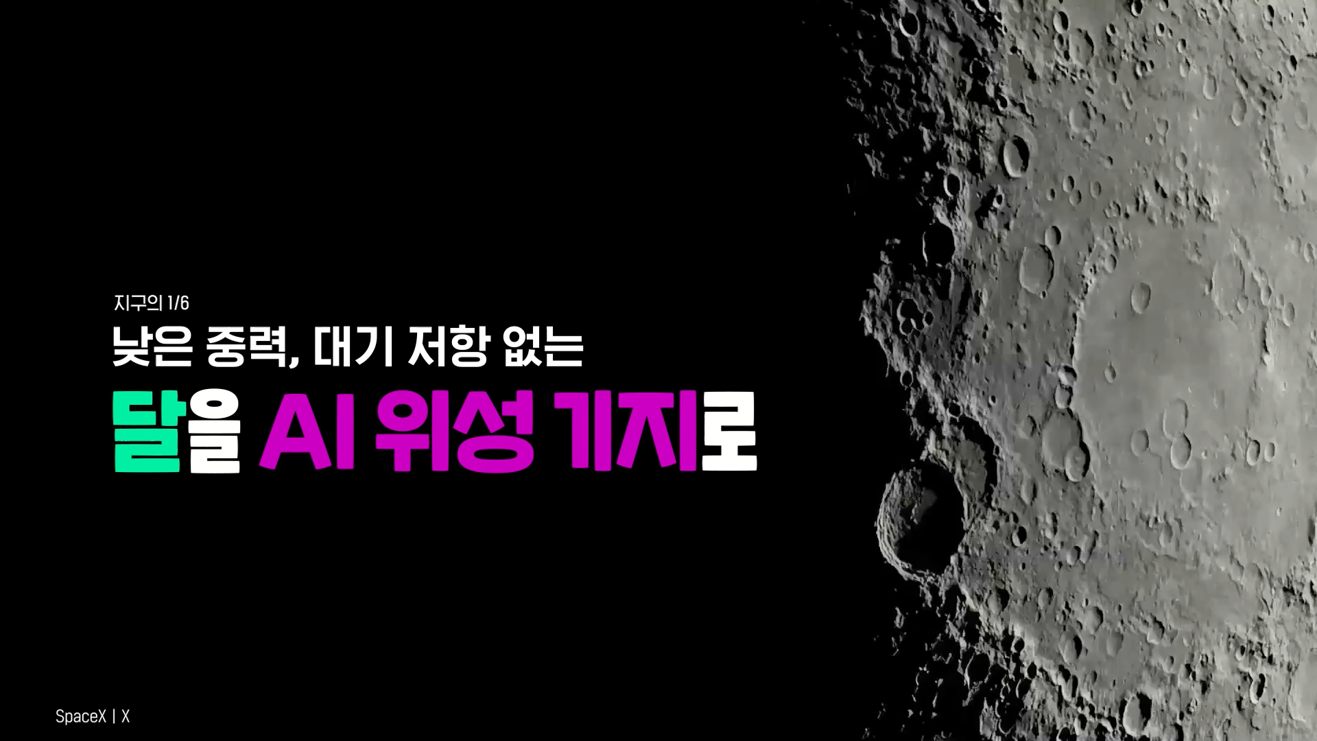 연간 TW라는 수치도 비현실적이지만, 머스크는 그 이상인 페타와트(PW) 시대의 청사진도 그리고 있습니다. 만약 지구의 인프라를 활용해 PW 수준의 컴퓨팅 파워를 생산하려면 하루에만 스타십을 135회 가까이 계속 발사해야 할 정도로 비현실적입니다. 이미 로켓 재활용으로 발사체 혁신을 가져온 일론 머스크는 이 문제를 해결하기 위한 더 경제적인 발사체를 구상하고 있죠. 바로 중력이 지구의 6분의 1 수준이고 대기가 없는 달에서 AI 위성을 쏘아 올리는 겁니다. 그래서 머스크가 생각하는 페타와트 시대의 핵심프로젝트는 바로 문베이스 알파 프로젝트입니다.