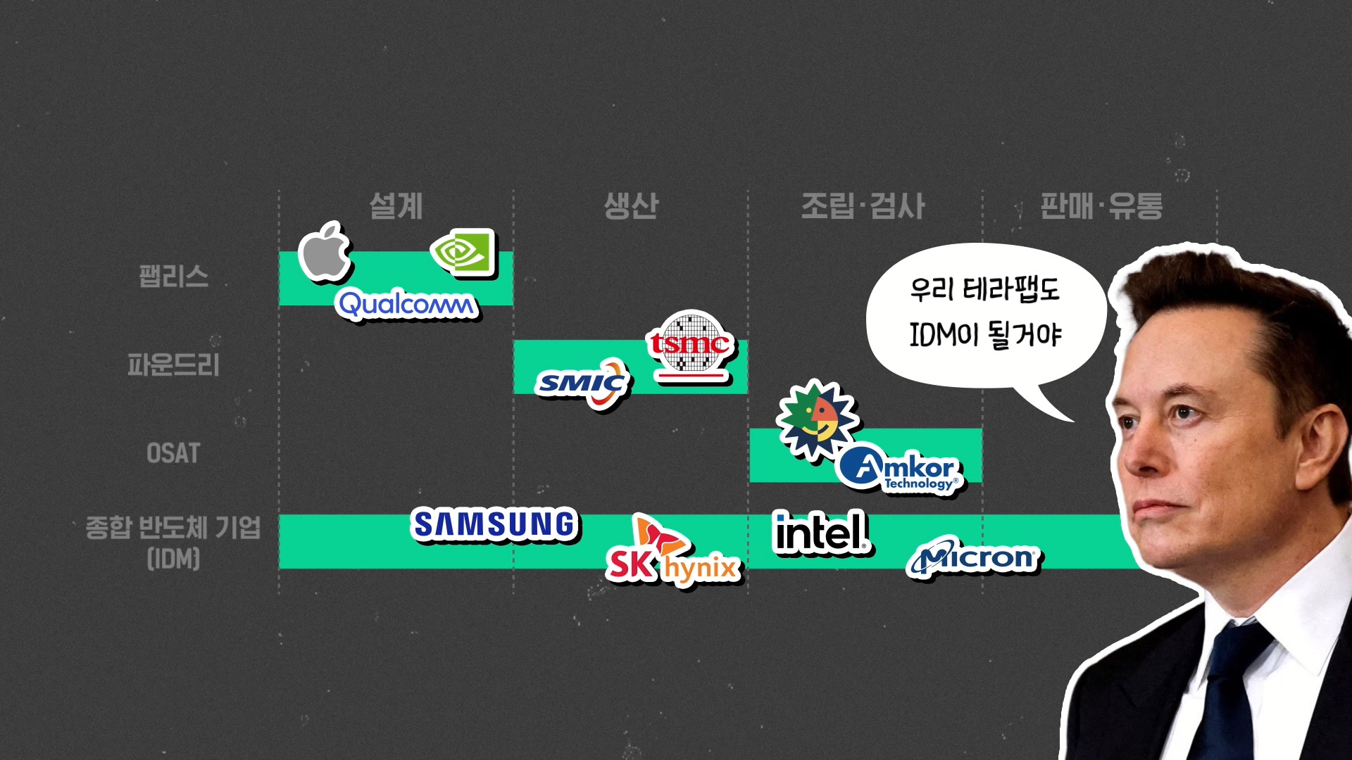 머스크가 꿈꾸는 테라팹은 단순히 설계와 생산만 하는 게 아닙니다. 설계부터 생산, 패키징과 테스트까지 총 망라해서 자신의 유니버스에 필요한 공급망을 손에 쥘 계획이죠. 반도체 시장은 여러 형태의 기업들이 협력해 하나의 생태계를 이루고 있습니다.