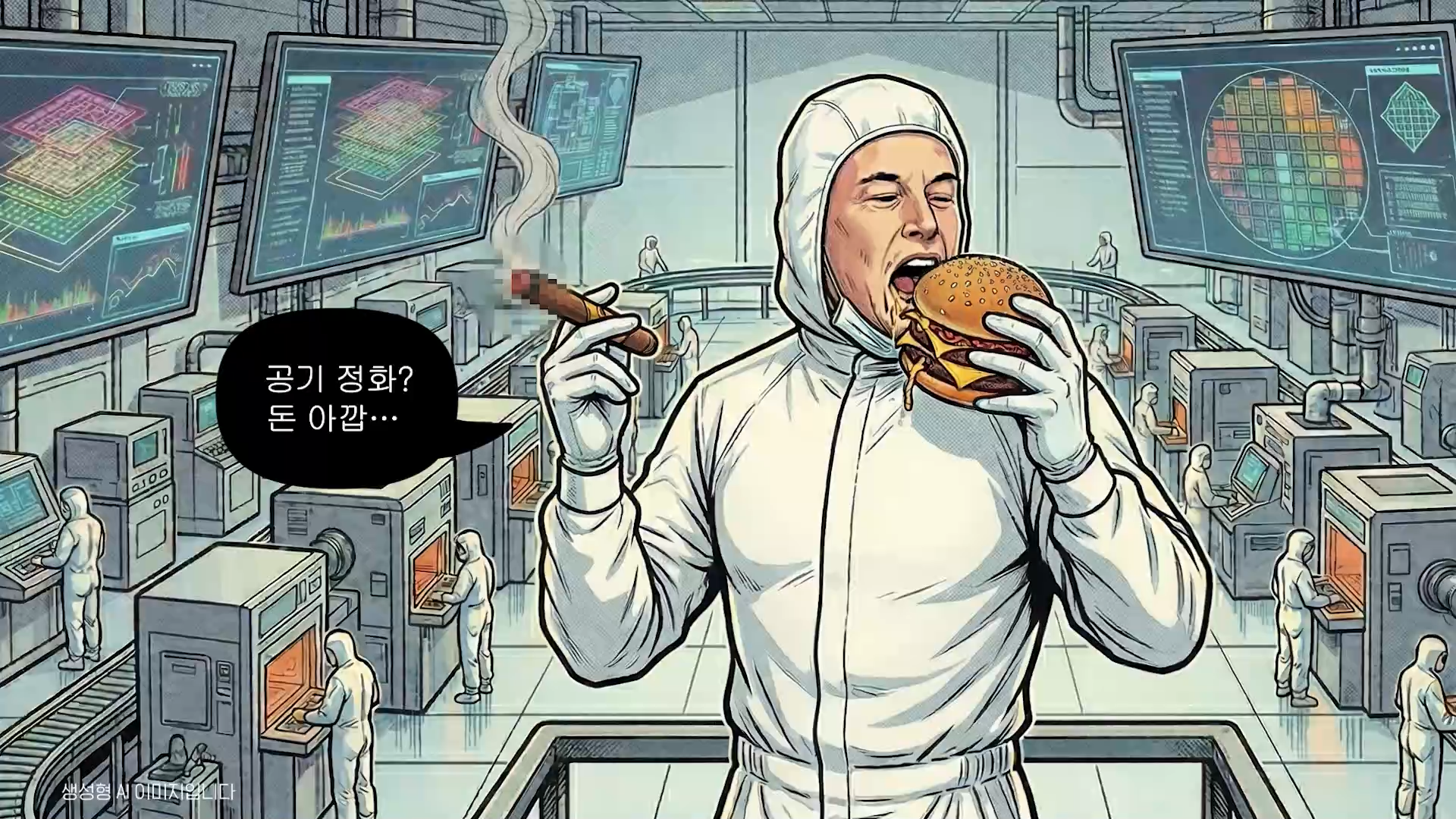 일론 머스크는 클린룸을 유지하는 데 들어가는 공기 정화 비용에 자원 낭비 안 하고 싶은 겁니다. 대신 실리콘 웨이퍼 공정만 밀폐해서 격리하면 충분히 생산이 가능한 것 아니냐는 입장인 거죠. 이 발언에 대해 반도체 전문가들은 쉽게 납득을 못하고 있습니다. 가령 공장 내에서 담배를 피우게 되면 담배의 미세 입자가 반도체 장비에 치명적인 손상을 입힐 수밖에 없거든요.