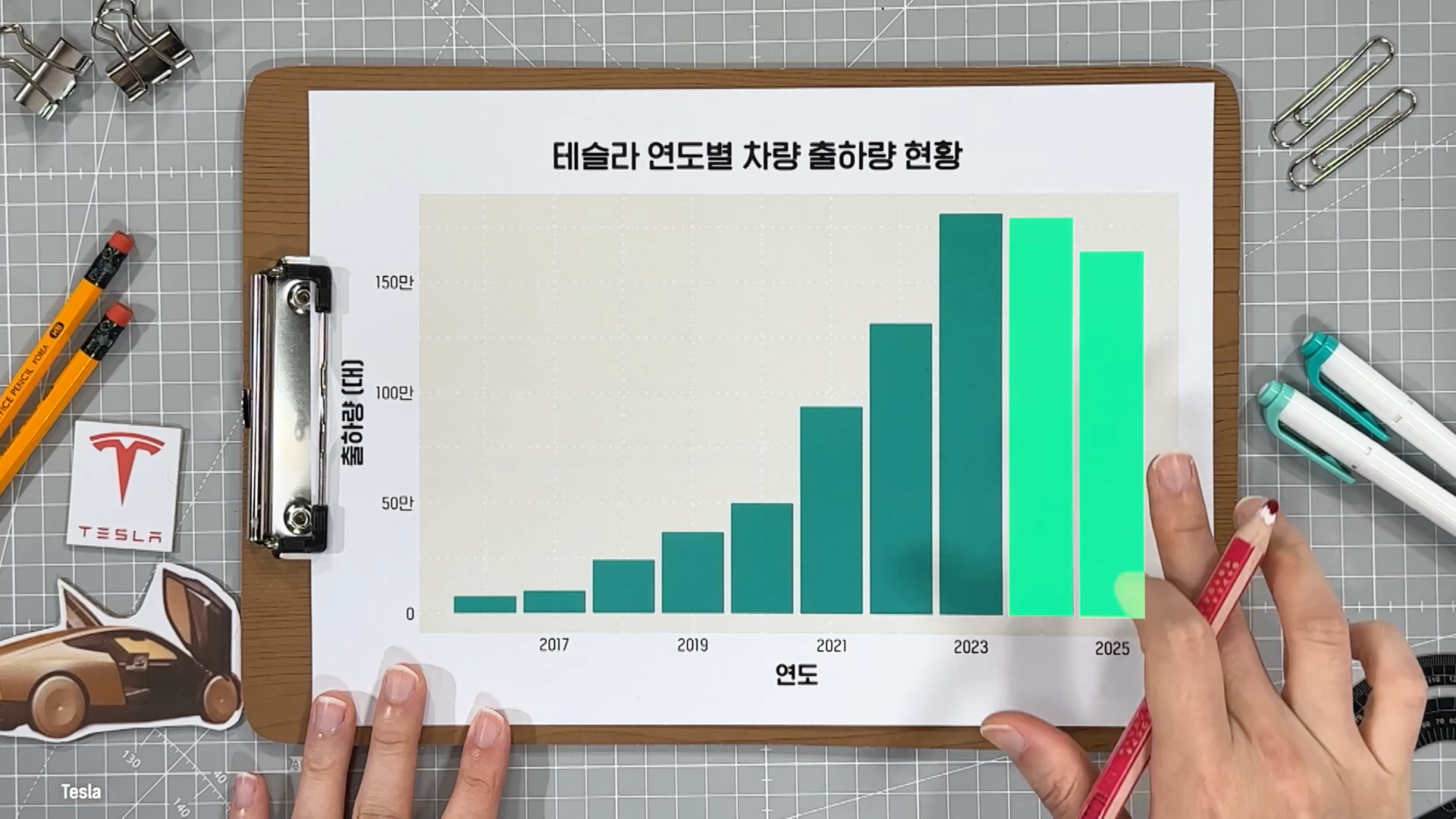 테슬라의 자동차 판매량은 2024년, 2025년 2년 연속 감소했습니다. 연간 매출도 2025년에 처음으로 3% 감소를 찍는 등 실적이 좋지 않아요. 해외에서는 주춤한 테슬라가 유독 한국에서만 잘 팔리고 있지만, 전체적인 실적 상황을 봤을 때 테슬라의 미래에 대한 비전이 필요한 시점인 거죠.
