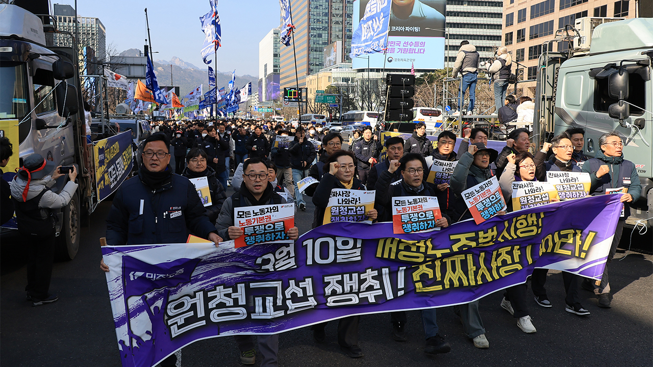 ▲ '노란봉투법'(노동조합 및 노동관계조정법 2·3조 개정 법률) 시행 첫날인 3월 10일 서울 세종로에서 열린 민주노총 투쟁 선포대회에서 집회를 마친 민주노총 조합원 등이 행진하고 있다.
