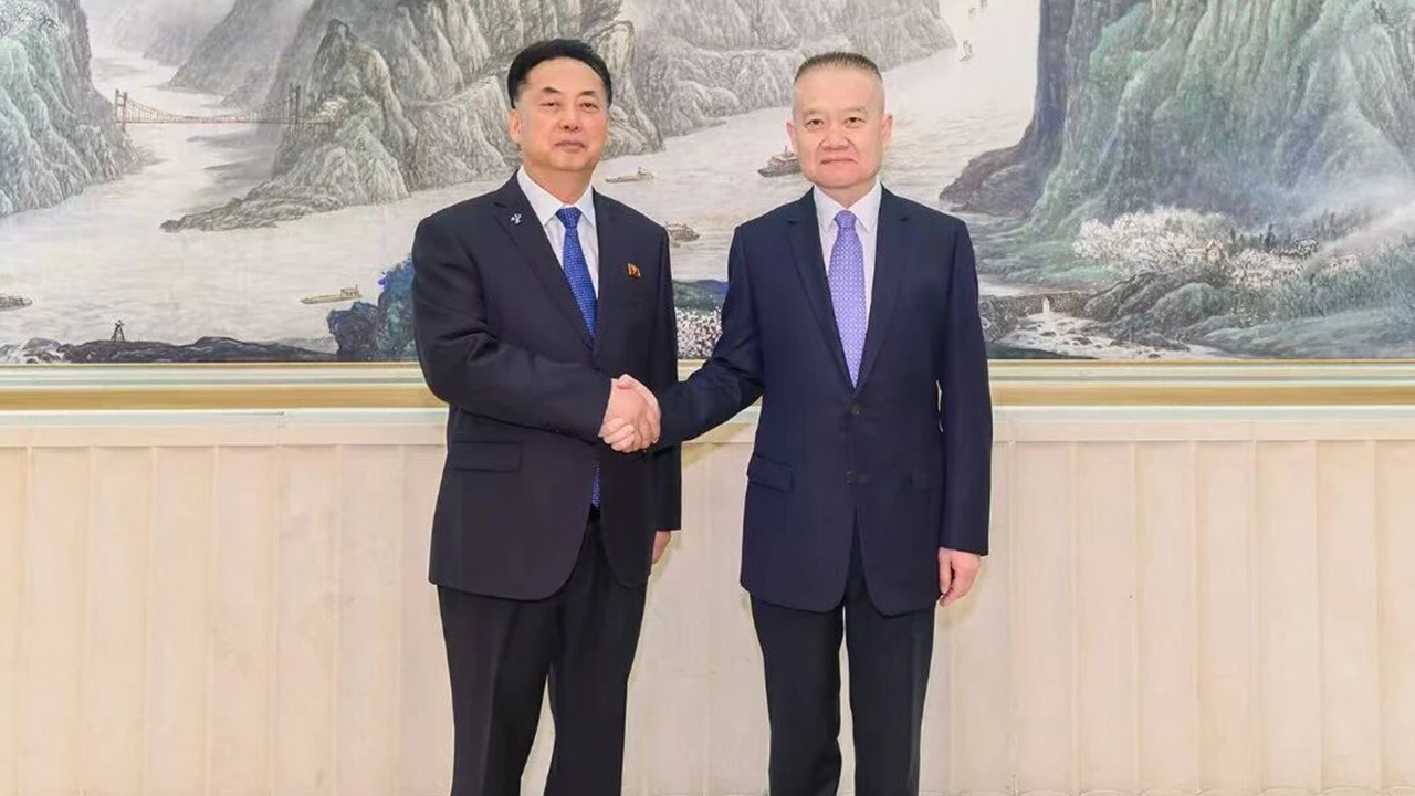 ▲ 악수하는 리룡남 주중 북한대사(왼쪽)과 류하이싱 중국공산당 대외연락부장