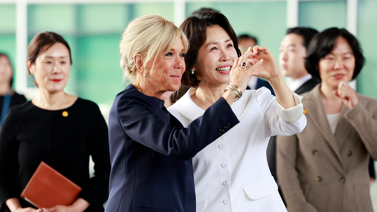 한편 관람객들이 환영의 뜻으로 "웰컴 투 코리아"를 외치자 브리지트 여사의 제안으로 두 여사가 '손하트'를 함께 만들어 보이기도 했습니다.