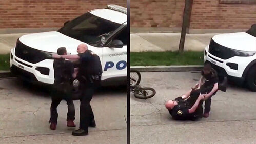 체포를 시도하던 경찰은 남성에게 밀려 그대로 바닥에 넘어지고, 남성은 곧바로 자전거를 타고 도망치지만 이마저도 중심을 잃고 쓰러지는데요.