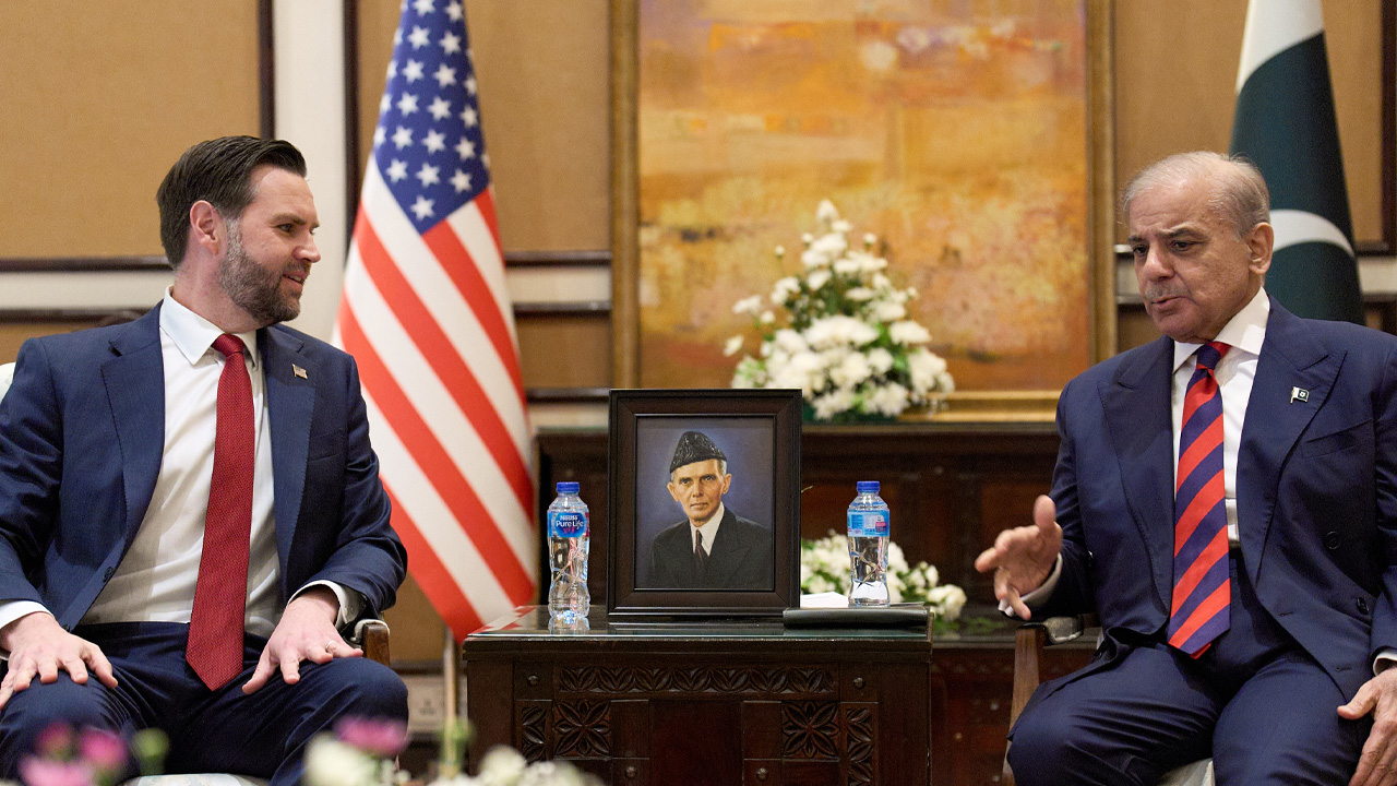 ▲ 2026년 4월 11일 JD 밴스(왼쪽) 미국 부통령과 셰바즈 샤리프(오른쪽) 파키스탄 총리가 이란 대표단과의 면담을 앞두고 얘기를 나누고 있다.