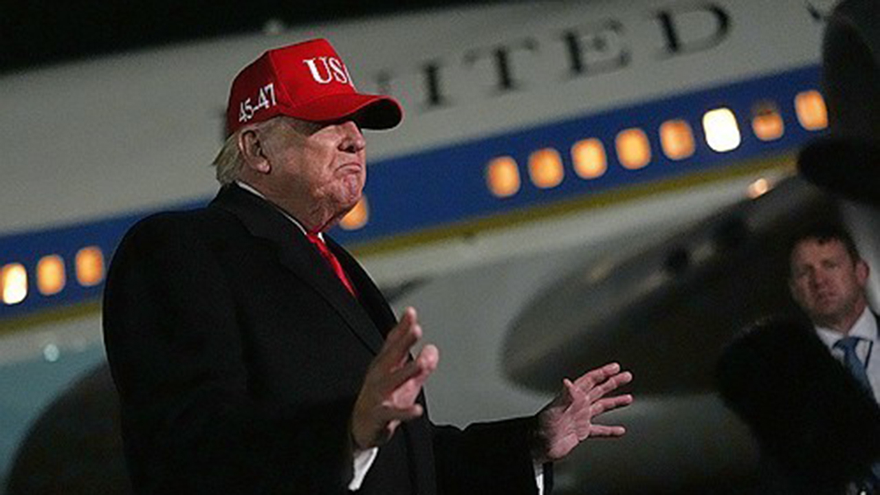 트럼프 대통령의 머리 뒤로는 후광이 비치는 동시에 미국을 상징하는 성조기와 독수리가 그려져 있고, 양손에서는 눈부신 빛이 새어 나옵니다.