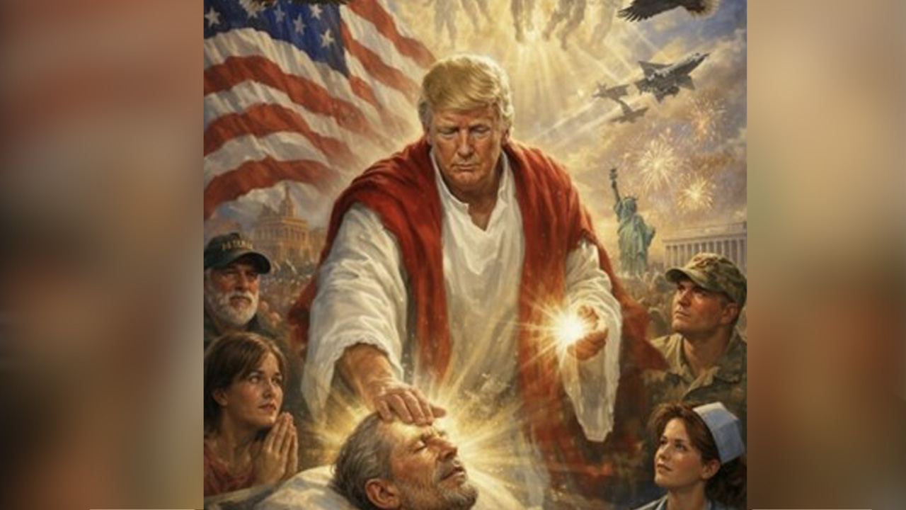 트럼프 대통령은 현지시간 12일 밤 자신의 소셜미디어 트루스소셜에 흰 옷을 입고 붉은 망토를 걸친 채 병든 사람의 이마에 손을 올린 이미지를 게시했습니다.
