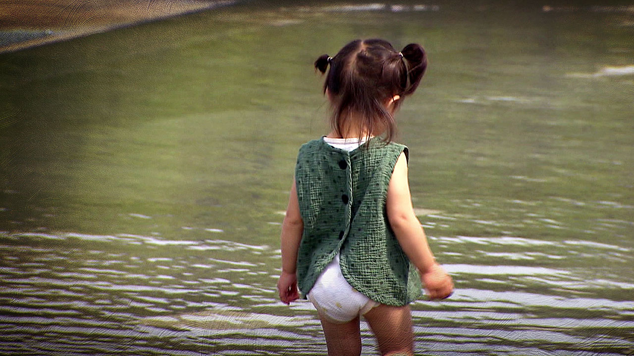 아이는 여름을 맞은 듯 물에 발을 담그고 물장구를 칩니다.