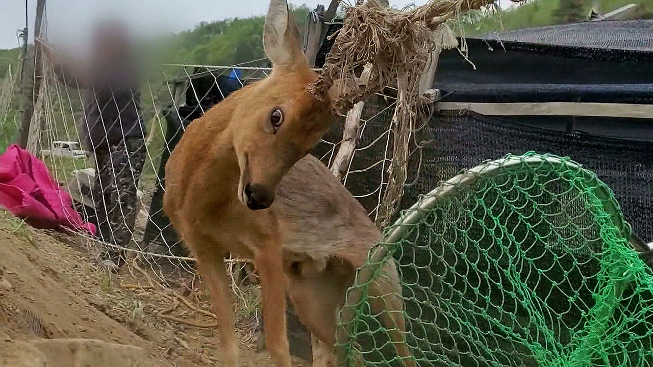 노루 한 마리가 인삼밭에 쳐 놓은 그물에 걸렸습니다.