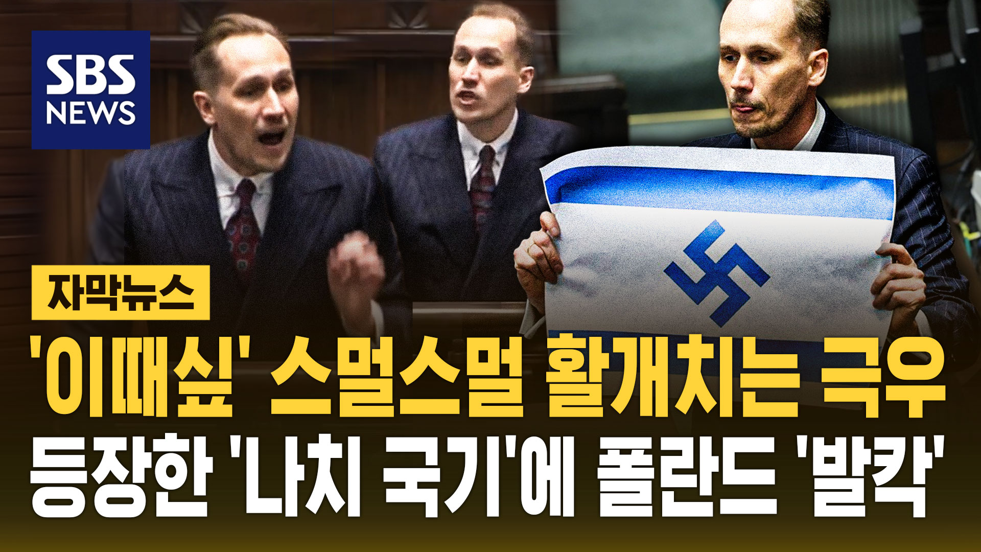 현지시간 어제(14일) 폴란드 의회에서 극우 성향 의원 콘라드 베르코비치가 의회 연설 도중 나치 문양이 들어간 변형 이스라엘 국기를 들어 올리며 이스라엘을 맹비난하고 나서 발칵 뒤집어졌습니다.