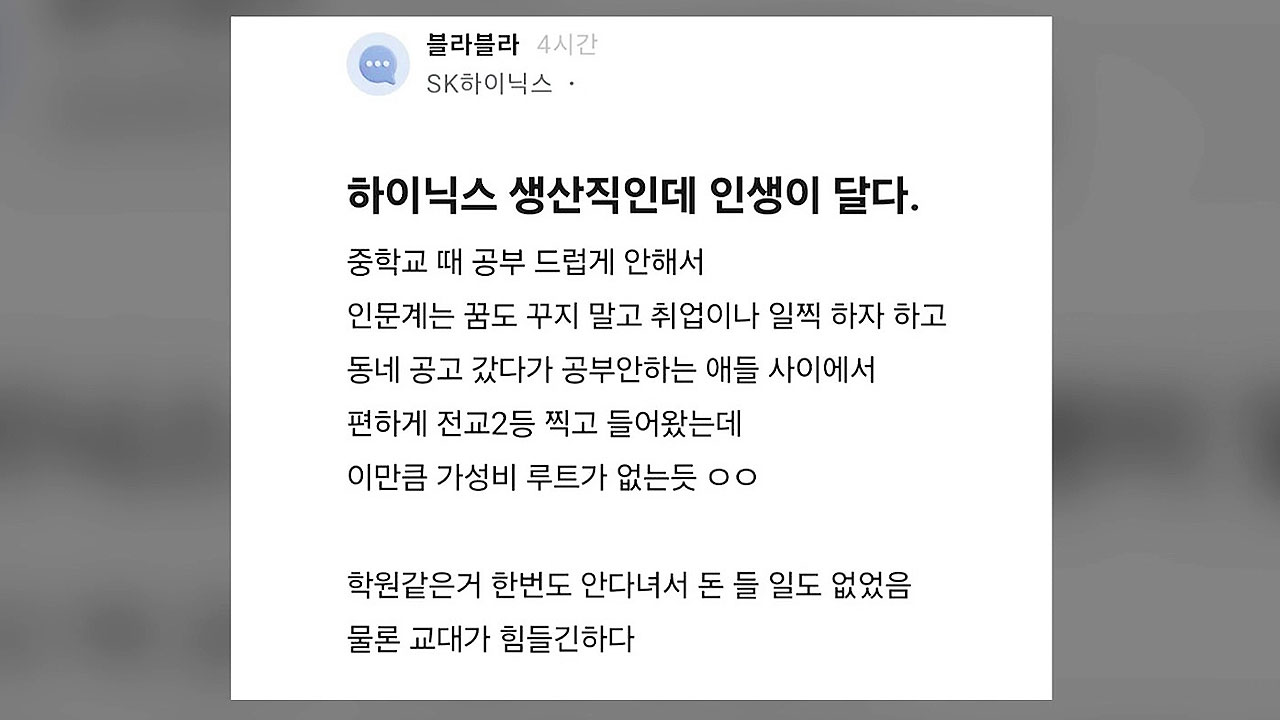 작성자 A 씨는 자신을 SK하이닉스 생산직 직원이라고 밝히며 "공부를 잘하지 못해 공업고등학교를 나와 취업했는데, 이만큼 가성비 좋은 선택은 없는 것 같다"고 적었습니다.