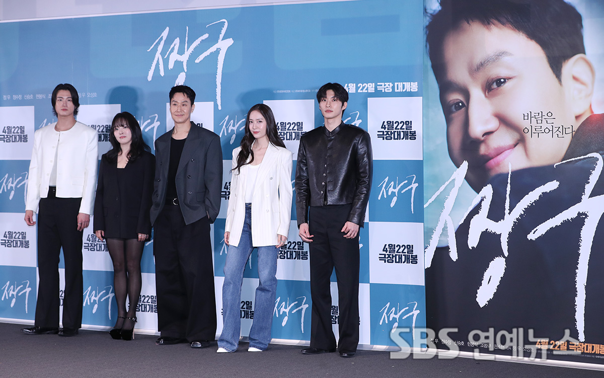 Actors Shin Seung-ho, Kwon So-hyun, Jung Woo, Krystal, and Jo Beom-gyu attend the media screening and press Q&A for the film “Audition 109” at CGV Yongsan I'Park Mall in Yongsan-gu, Seoul, on the afternoon of April 16, posing for photos.