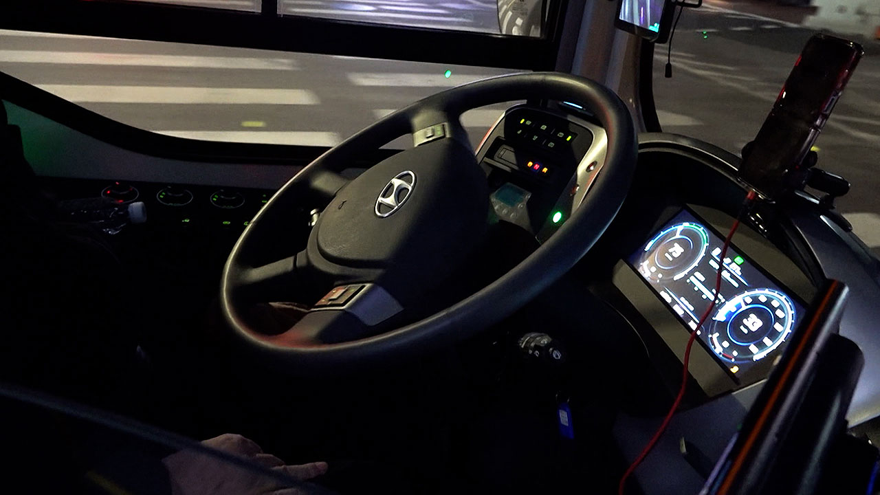 버스가 신호등을 비롯한 주변 교통 시설과 대화하듯 교통 정보를 주고받는데, 예를 들어 5초 뒤에 적색 신호로 바뀐다는 정보를 받으면 주변 상황을 고려해 속도를 올려 통과할지, 그대로 멈춰 설지 버스가 판단하는 겁니다.