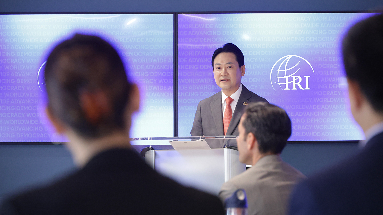 ▲ 미국을 방문 중인 국민의힘 장동혁 대표가 지난 15일(현지시간) 워싱턴DC 국제공화연구소(IRI)를 방문해 스피치하고 있다