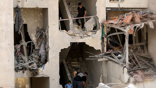 완전히 무너져 내린 건물의 잔해가 가득 쌓여 있습니다.