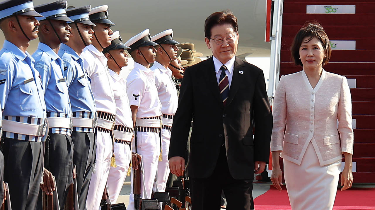 ▲ 인도를 국빈 방문한 이재명 대통령과 김혜경 여사가 현지 시간 19일 뉴델리 팔람 공군기지에 도착한 공군 1호기에서 내려 이동하고 있다.