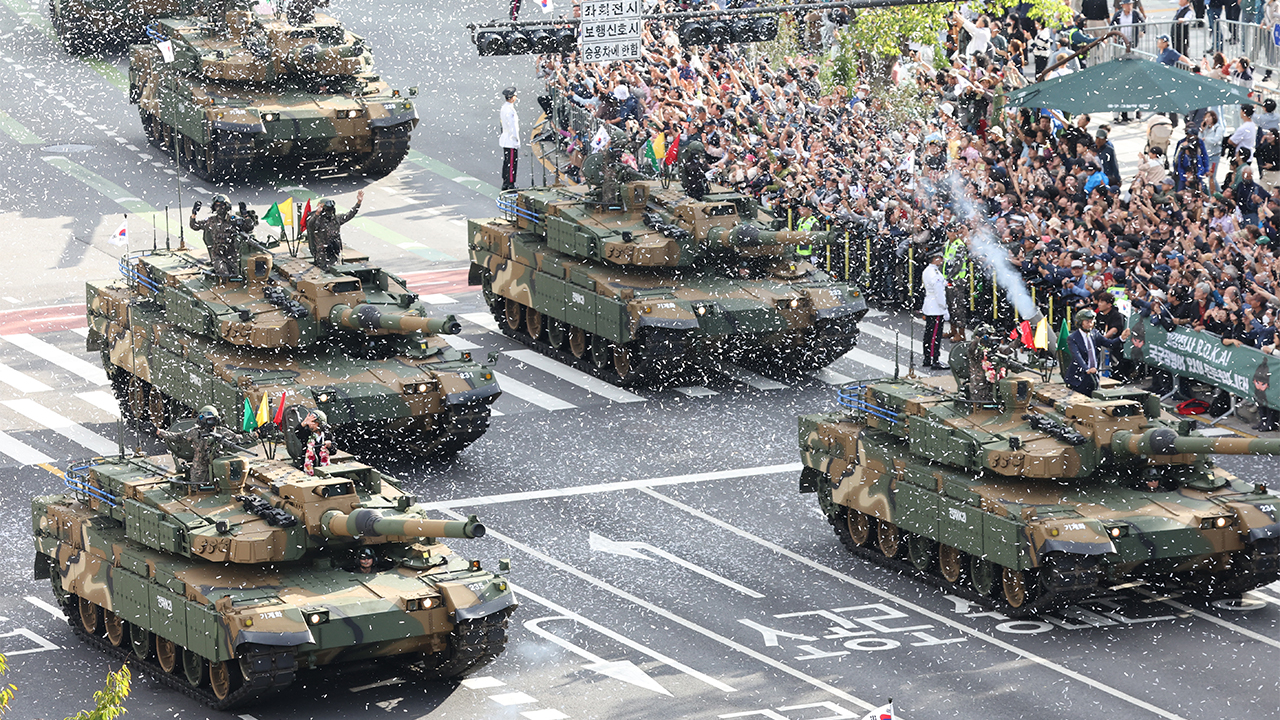 ▲ 건군 제76주년 국군의 날 시가행진이 열린 2024년 10월 1일 서울 중구 세종대로에서 시민들이 거리행진 하는 K-2 전차를 향해 손을 흔들고 있다.