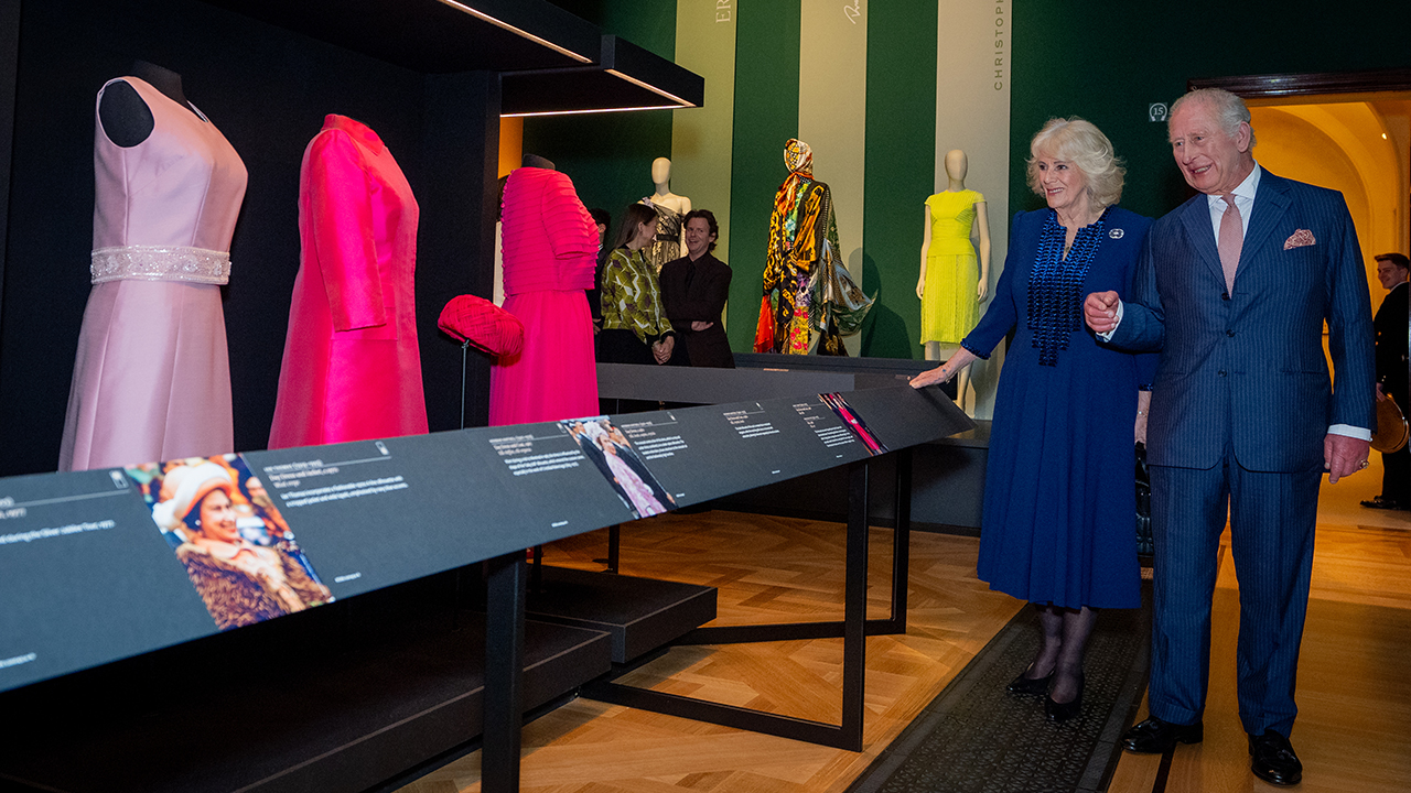 ▲ 지난 20일 영국 런던 버킹엄 궁전 킹스 갤러리에서 열린 엘리자베스 2세 여왕의 삶과 패션을 조명하는 전시회에 찰스 3세 국왕과 카밀라 왕비(왼쪽)가 방문한 모습