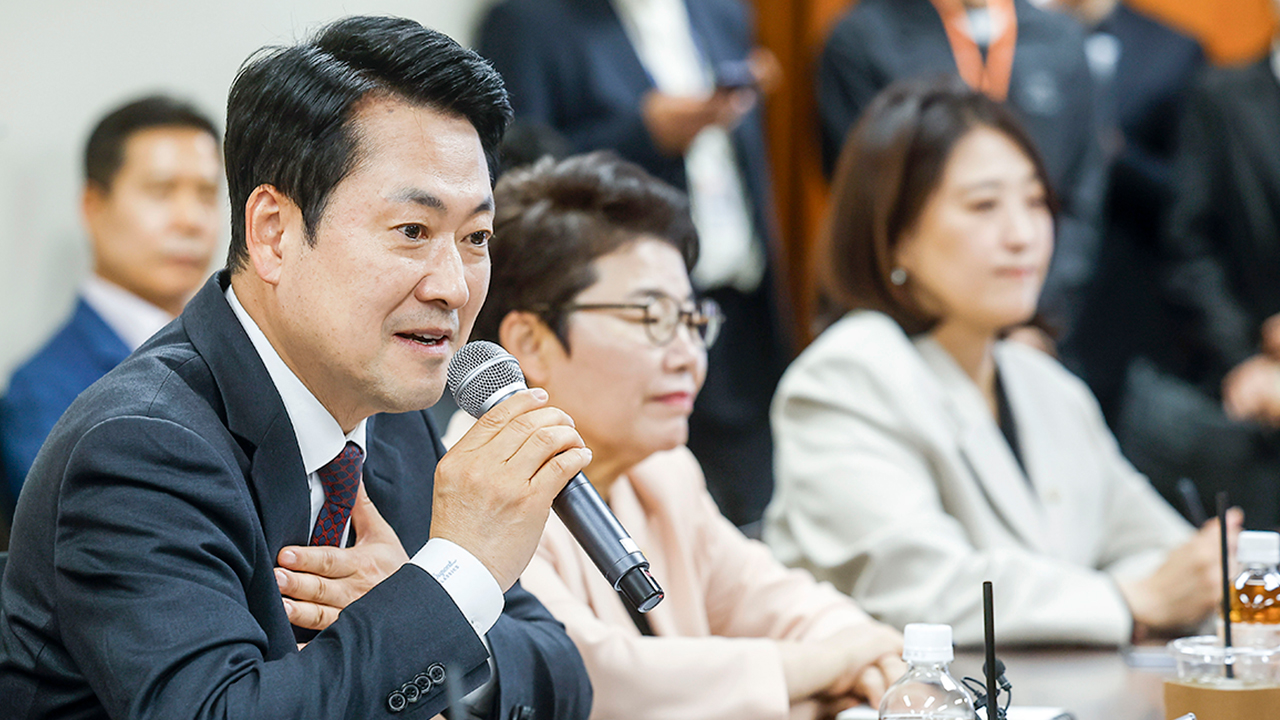 ▲ 국민의힘 장동혁 대표(왼쪽)가 21일 서울 영등포구 한국노총 서울지역본부에서 열린 국민의힘-한국노총서울지역본부 간담회에서 발언하고 있다.