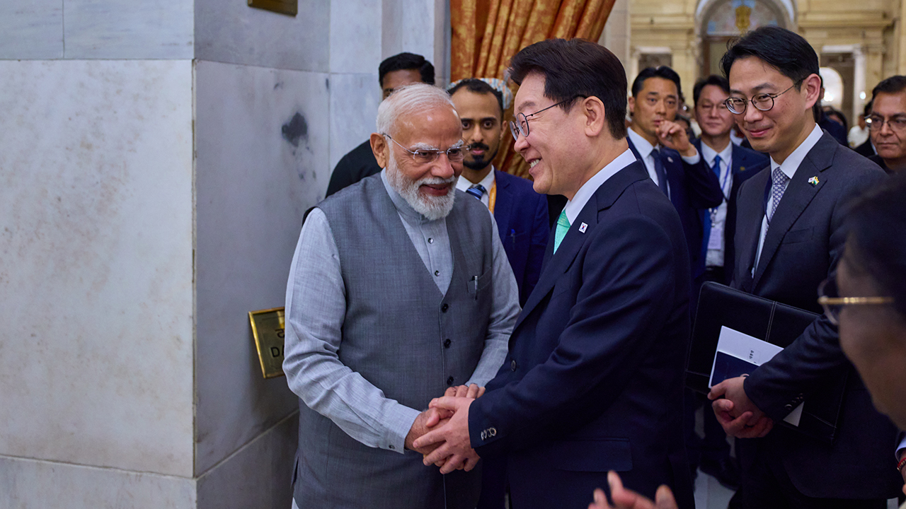 ▲ 이재명 대통령과 나렌드라 모디 인도 총리가 20일(현지시간) 인도 뉴델리 대통령궁에서 열린 드로우파디 무르무 인도 대통령 주최 국빈 만찬에서 악수하고 있다.