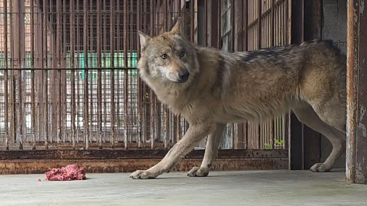 ▲ 대전오월드에서 탈출했다 9일 만인 지난 17일 생포돼 돌아온 늑대 '늑구'가 지난 20일 닭고기와 소고기 분쇄육을 먹다가 주변을 두리번거리고 있다.