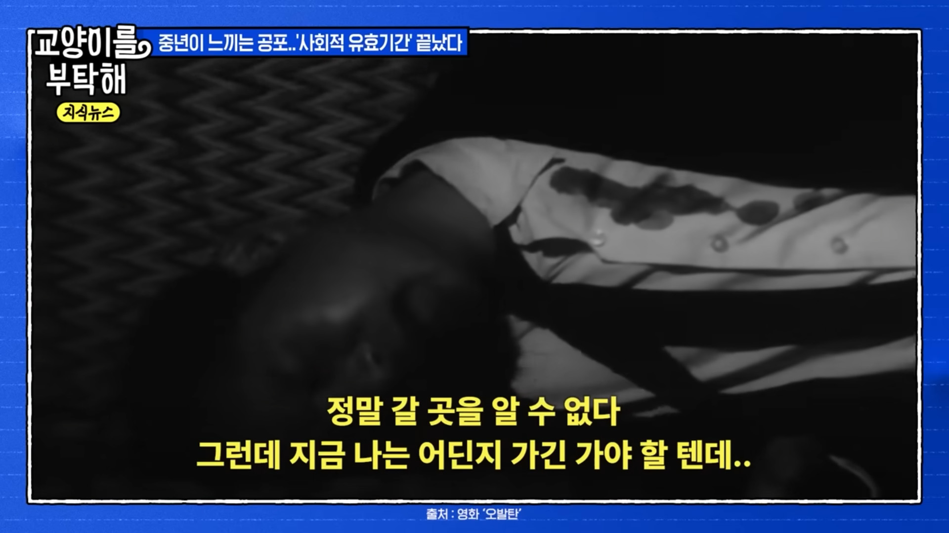 '오발탄'이라는 소설 들어보신 적 있죠. 거기 마지막 장면이 뭐냐 하면 나는 인생을 바쳐서 되게 열심히 일하고 자식들을 위해서 사회를 위해서 이렇게 했는데 이제는 나를 사람들이 다 쓸모없는 사람으로 치네. 나는 이 사회에 그냥 오발탄인가 보다라는 얘기하면서 끝나요.