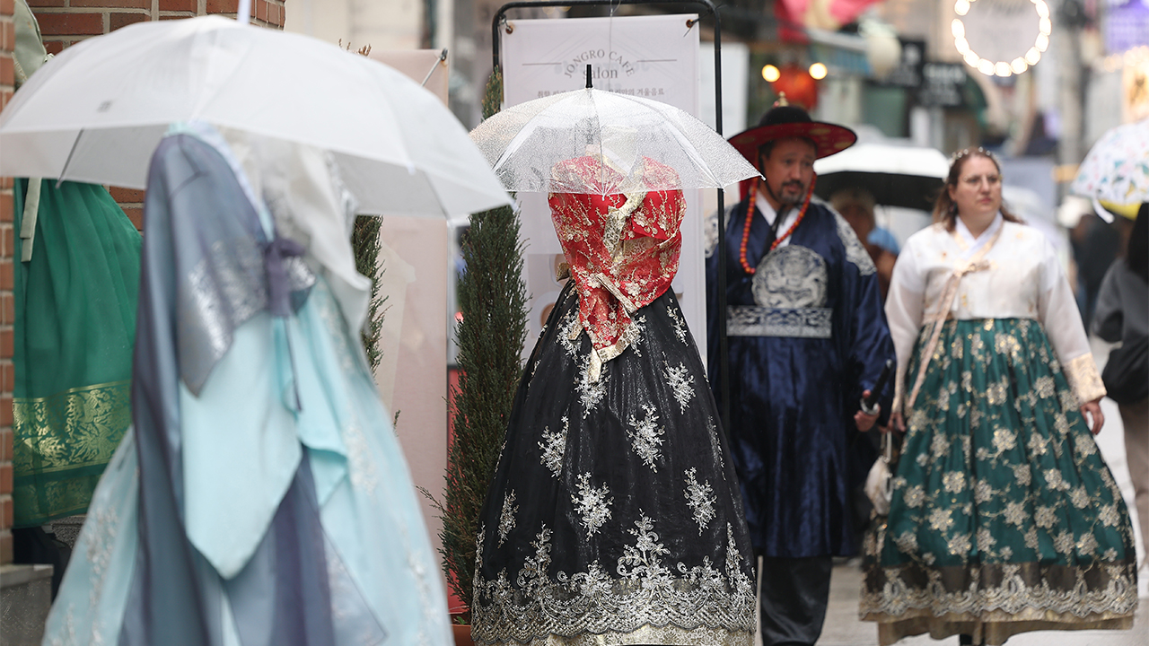 ▲ 서울에 비가 내린 20일 서울 종로구 경복궁 인근 한 한복 대여 업체 마네킹에 우산이 씌워져 있다.