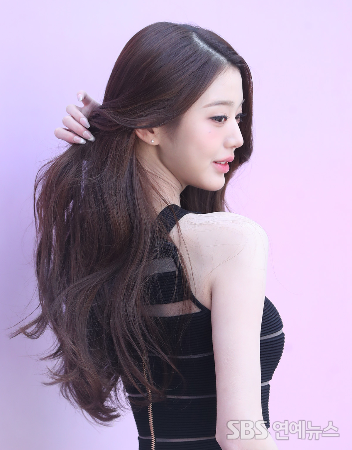JANG WONYOUNG of the group IVE poses at a beauty brand photo wall event held in Seongsu-dong, Seongdong-gu, Seoul, on the morning of April 23.