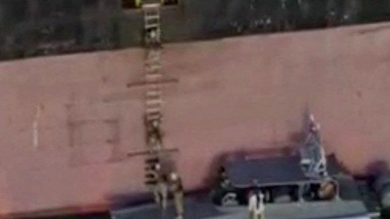 복면을 쓰고 총으로 무장한 이란 군이 사다리를 타고 올라가 선박을 장악합니다.