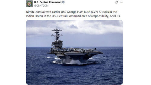 중동 지역을 관할하며 이란 전쟁을 총괄 지휘하고 있는 미 중부사령부는 이날 엑스(X·옛 트위터)에 "니미츠급 항공모함 조지 H.W.부시호가 4월 23일 중부사령부 책임 구역인 인도양에서 항해하고 있다"고 밝혔습니다.