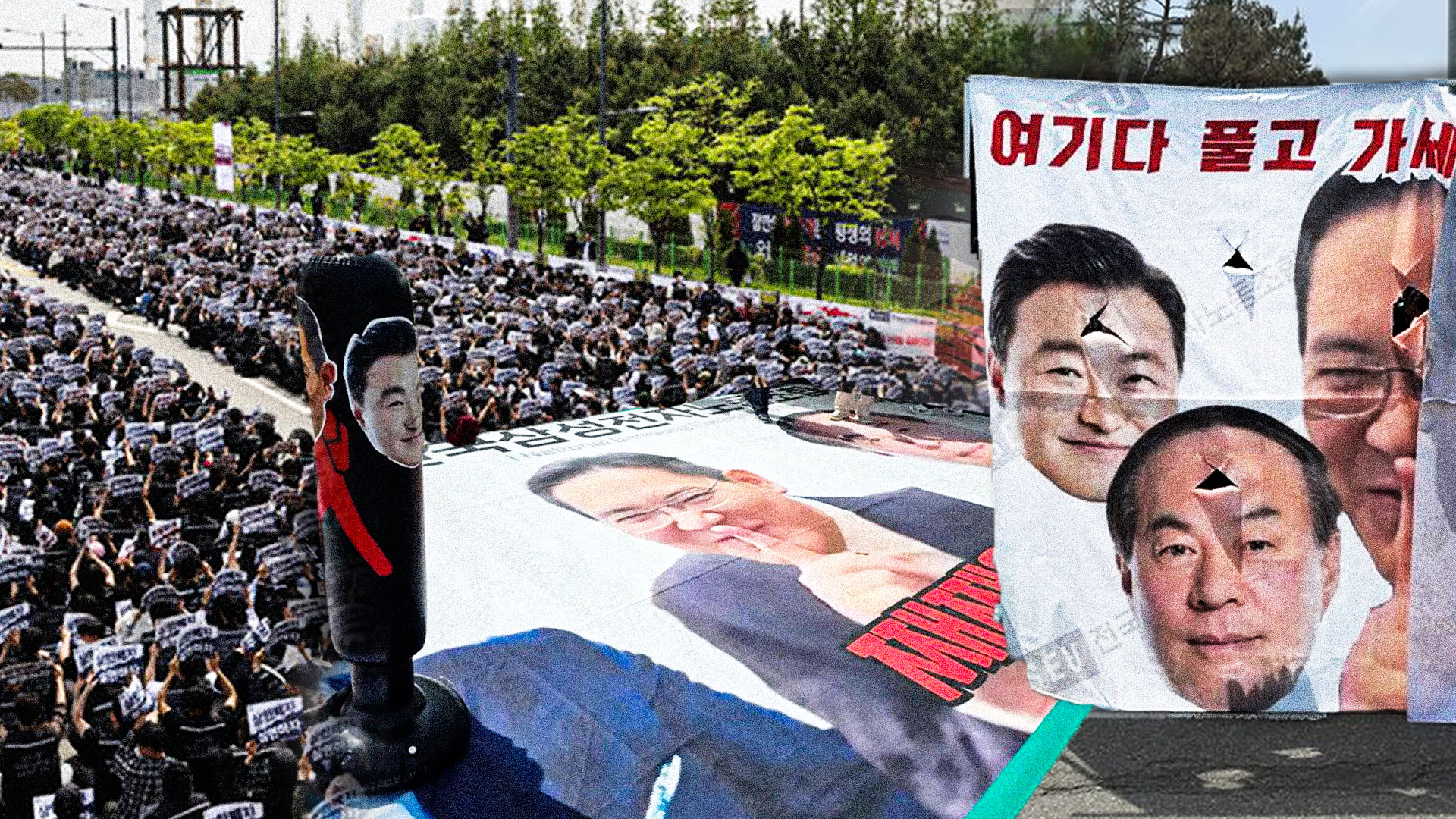 성과급 상한제 폐지 등을 요구하며 다음 달 총파업을 예고한 삼성전자 노동조합이 23일 대규모 집회를 열었습니다. 이날 집회 현장에는 경영진을 겨냥한 조롱 성격의 설치물이 등장하기도 했습니다.
