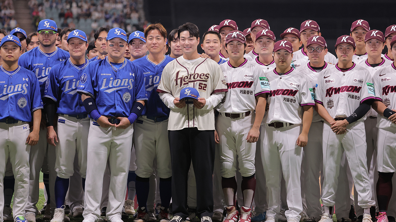 ▲ 박병호 키움 히어로즈 코치가 26일 서울 고척스카이돔에서 프로야구 삼성 라이온즈와의 홈경기에 앞서 열린 은퇴식에 참석해 키움-삼성 선수들과 기념촬영을 하고 있다.