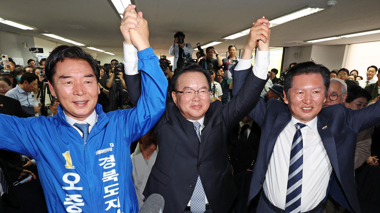 ▲ 26일 오후 대구 달서구 두류역 인근에 마련된 더불어민주당 김부겸 대구시장 예비후보의 희망캠프 선거사무소 개소식에서 왼쪽부터 오중기 경북도지사 예비후보와 김 예비후보, 정청래 대표가 손을 맞잡고 있다.
