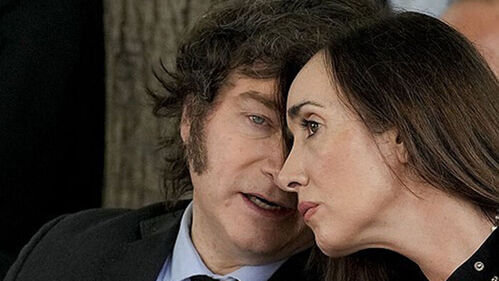 ▲ 지난 2024년 3월 18일 옛 이스라엘 대사관 터에서 열린 행사에서 아르헨티나의 하비에르 밀레이(왼쪽) 대통령과 빅토리아 비야루엘(오른쪽) 부통령이 얘기를 나누고 있다.