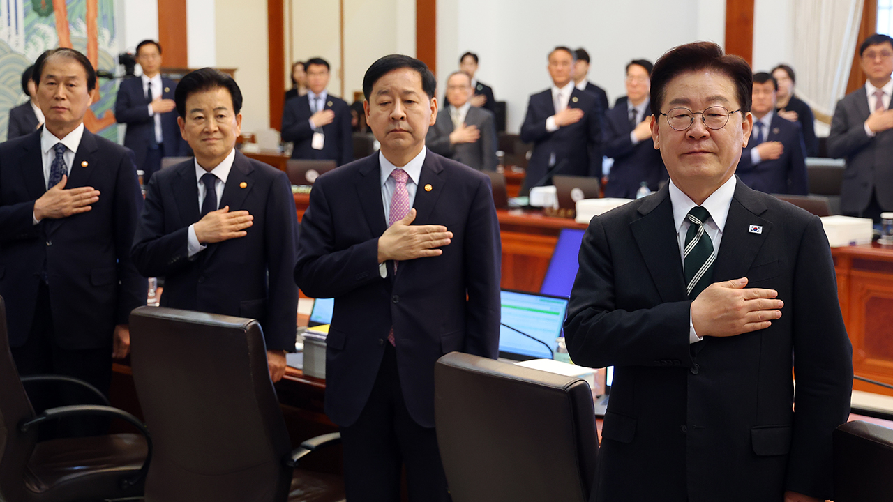 ▲ 이재명 대통령이 28일 청와대에서 열린 국무회의 겸 비상경제점검회의에서 국기에 경례하고 있다.