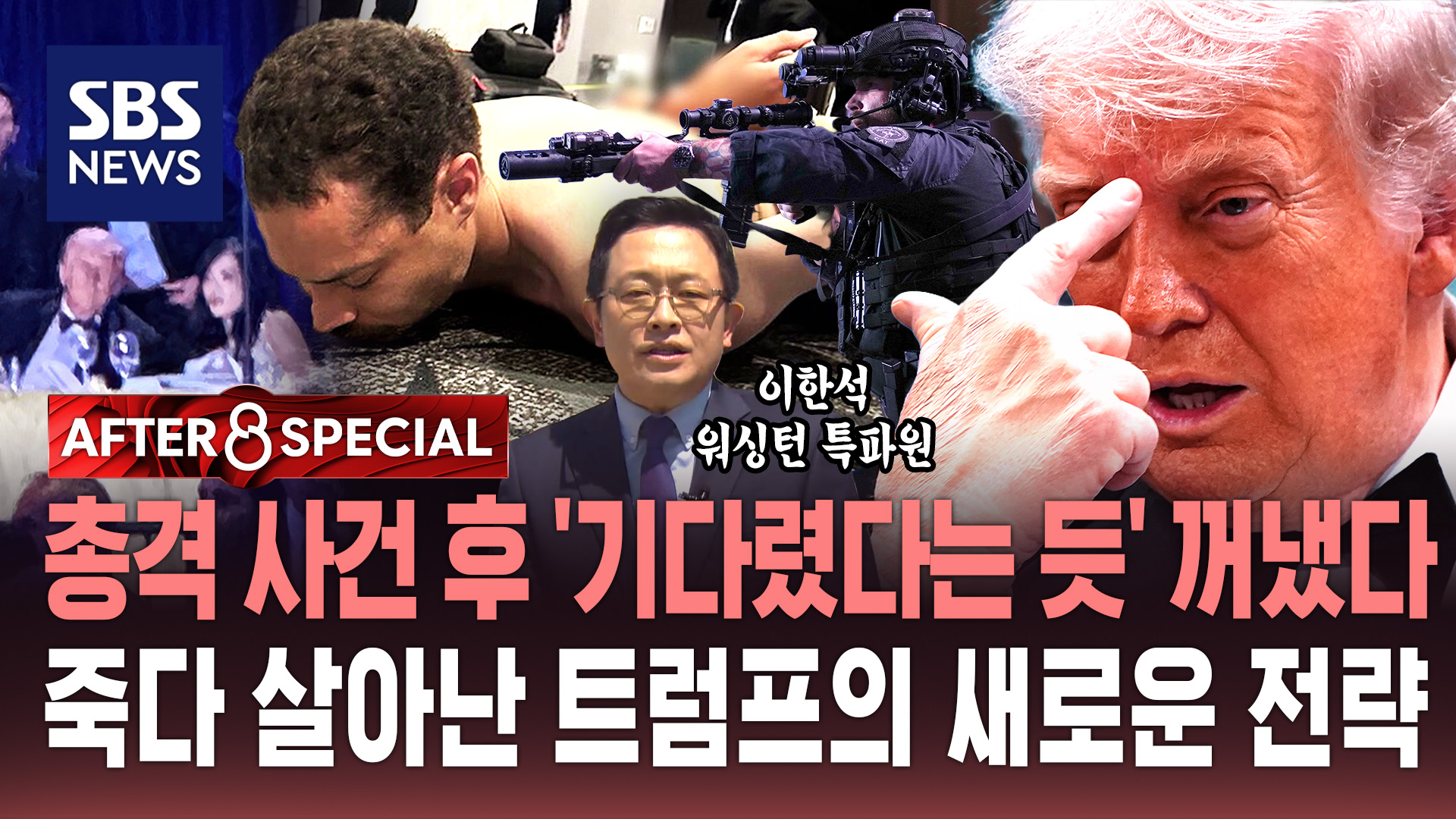 총격사건이 발생한 워싱턴 힐튼호텔 앞입니다. 1981년 로널드 레이건 대통령 암살 미수 사건이 발생했던 바로 그 장소입니다. 불과 사흘 전까지만 해도 미국 내부에선 트럼프 대통령을 TACO라며 조롱하는 여론이 적지 않았습니다. 'Trump Always Chickens Out' '트럼프는 항상 마지막에 겁먹고 물러난다'는 뜻인데 이란과의 전쟁 위기 속에서 폭격을 예고했다가 돌연 휴전을 연장하자 언론에선 트럼프를 말만 앞세우고 결정적 순간에 발을 빼는 겁쟁이라고 비아냥거렸습니다. 유가 폭등과 인플레이션 속에 트럼프의 지지율은 33%까지 추락했고, '타코 화요일'이라는 밈은 트럼프의 정치적 생명력을 갉아먹고 있었습니다. 그런데 45년 만에 현직 대통령을 겨냥한 총격 사건이 또 다시 발생하면서 미국 사회는 큰 충격에 빠졌습니다. 총성이 들리자 백악관 기자단 만찬장에 있었던 대부분의 사람들이 깜짝 놀랐고 탁자 뒤로 몸을 숨기며 불안한 표정을 짓기도 했습니다. 경호원들도 용의자의 핵심 타깃이었던 트럼프를 에워쌌고 트럼프도 몸을 숨겼습니다. 그런데 대피한 지 2시간 만에 트럼프 대통령은 여유로운 표정으로 긴급 기자회견을 자청했습니다.
