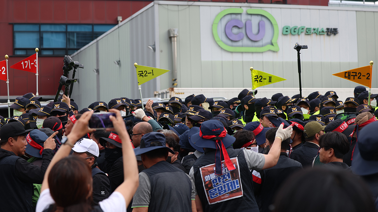 ▲ 지난 20일 오후 경남 진주시 정촌면 BGF로지스 진주센터에서 화물연대 관계자가 센터 입구로 진입하려는 과정에서 경찰과 대치하고 있다.