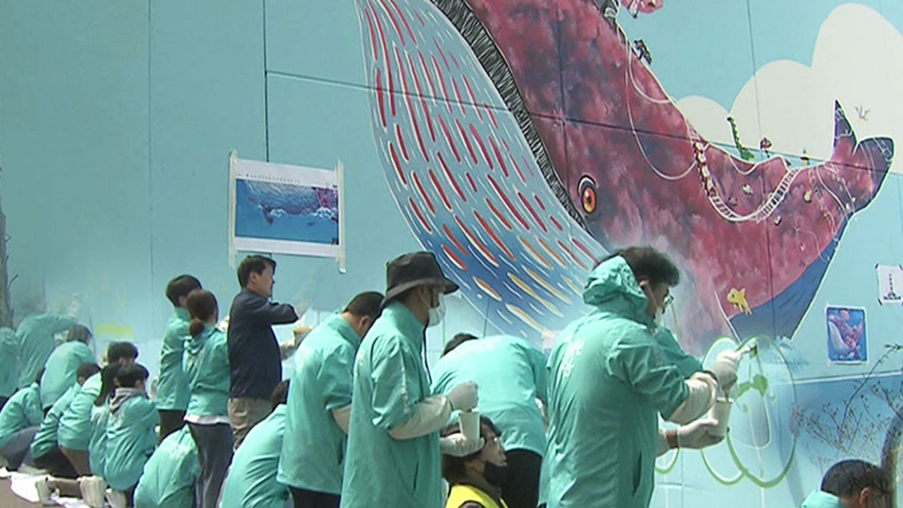 [조태성/작가 (발달장애인 미술 공모전 대상) : 대왕고래가 부드러운 이미지도 있고, 이 노인 회관 이미지에 잘 맞기도 해서 그런 것도 있고, 제가 수염고래를 엄청 많이 좋아하거든요.]