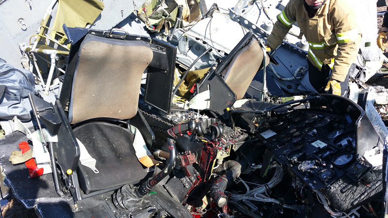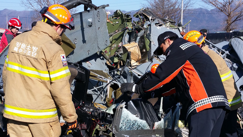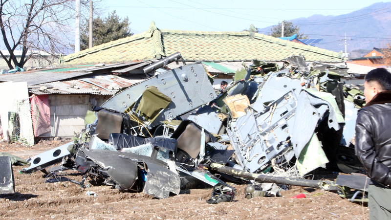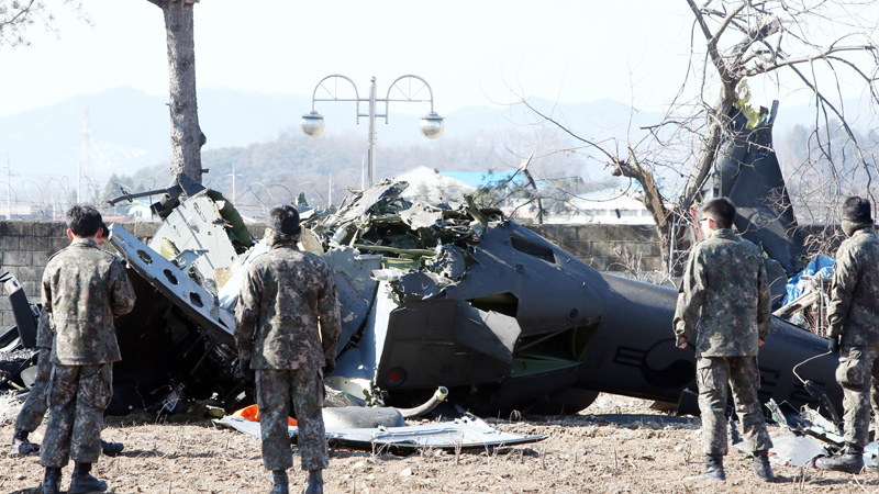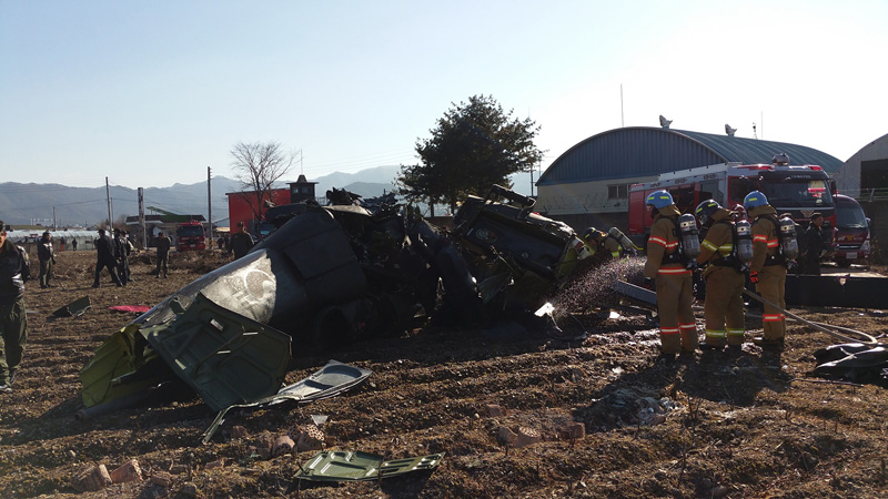 15일 오전 강원 춘천시 신북읍 율문리 인근 밭에 육군 헬기가 추락해 군 당국이 현장에서 사고를 수습하고 있다.(춘천=연합뉴스)