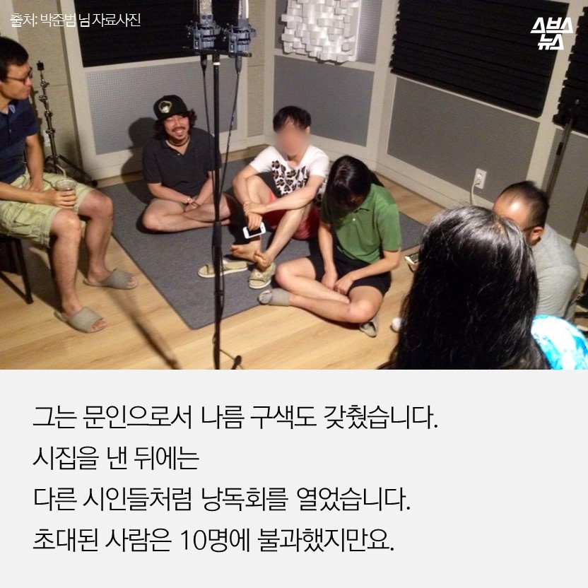 그는 문인으로서 나름 구색도 갖췄습니다. 시집을 낸 뒤에는 다른 시인들처럼 낭독회를 열었습니다. 초대된 사람은 10명에 불과했지만요.