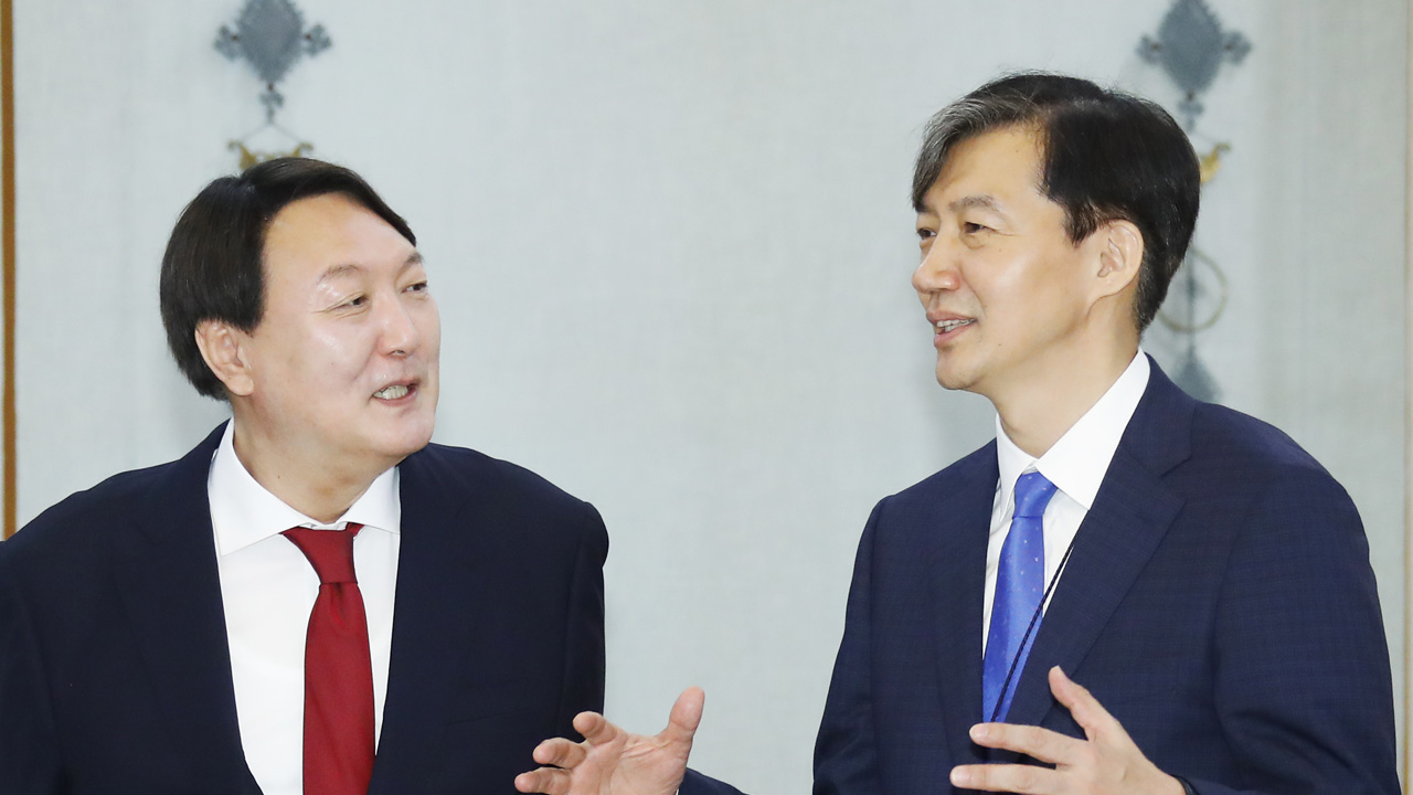 조국 민정수석과 윤석열 신임 검찰총장이 25일 오전 청와대에서 열린 임명장 수여식에 앞서 열린 차담회에서 대화하고 있다.