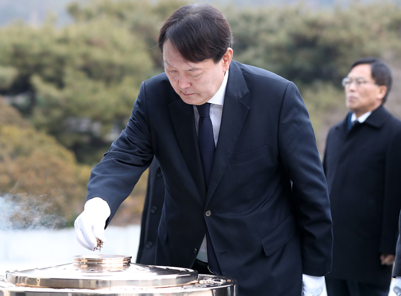 윤석열 검찰총장이 새해 첫 근무일인 2일 오전 서울 동작구 국립서울현충원을 방문해 현충탑에 분향하고 있다.