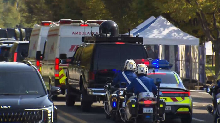 전용기 내려 주먹 불끈…경주서 '달리는 백악관' 탔다